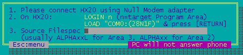 Select the Main Menu option H to obtain the above dialog, then follow the three steps shown on screen. You can download any Epson HX20 basic program into any of the HX20's five program areas. This should only be attempted locally, as there is no error detection capability in the HX20 LOAD command.