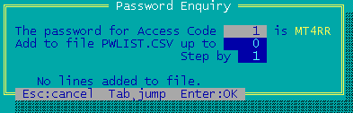 If the up to field is greater than the Access Code field, the specified list of Access Code and Password pairs is added to the "comma separated variable" file PWLIST.CSV in GO.EXE's current directory (creating the file if necessary). This enables you to import a password list into an external application.